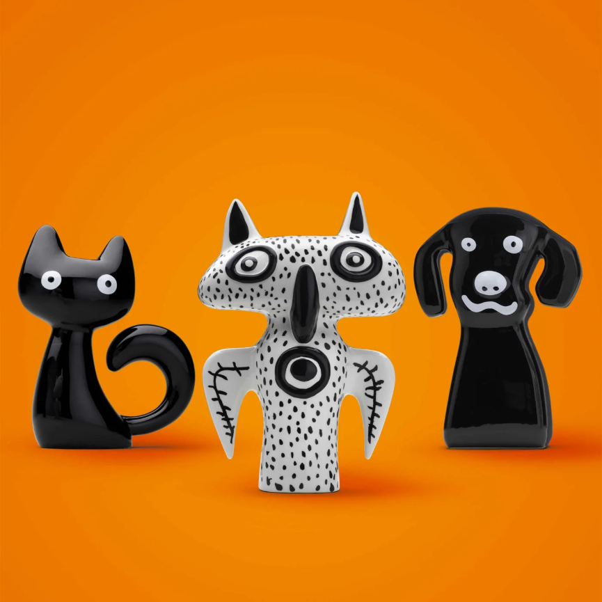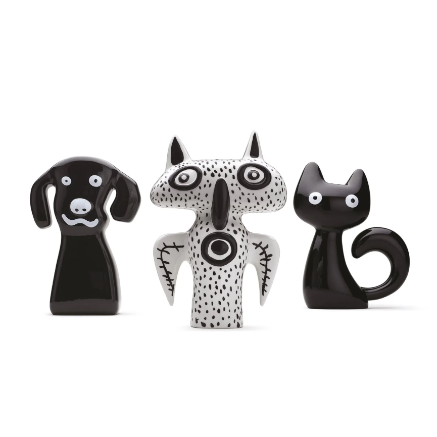 Il vaso Dalila, parte della collezione Kritters firmata da Kris Ruhs, è una scultura in ceramica che rappresenta un elegante gatto stilizzato in bianco e nero.