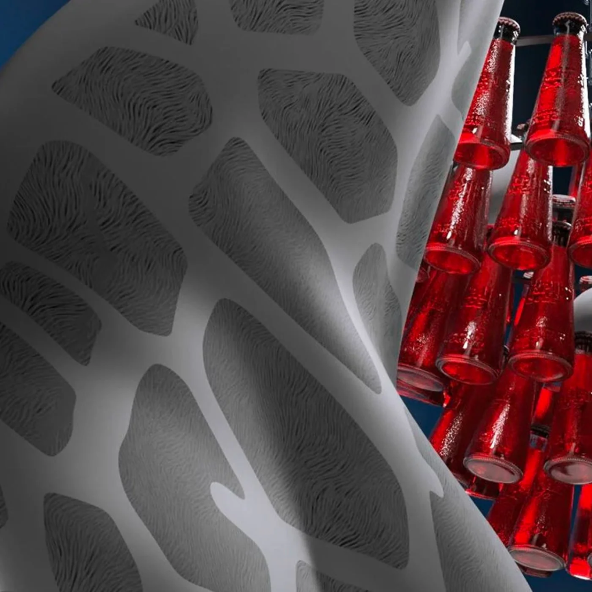 Alta 2,65 metri, questa versione speciale sorregge un lampadario realizzato con le iconiche bottiglie di Campari Soda, trasformando un oggetto di design già scenografico in un’opera ancora più audace, pop e immediatamente riconoscibile.