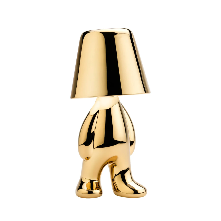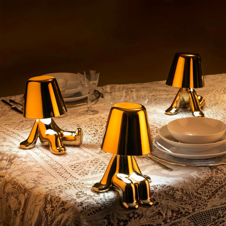Ogni personaggio è una lampada LED ricaricabile, dotata di interruttore soft touch, che permette di accendere e regolare la luce con un semplice gesto. Raffinati, iconici e scenografici, i Golden Brothers sono diventati una delle collezioni più riconoscibili di Qeeboo.
