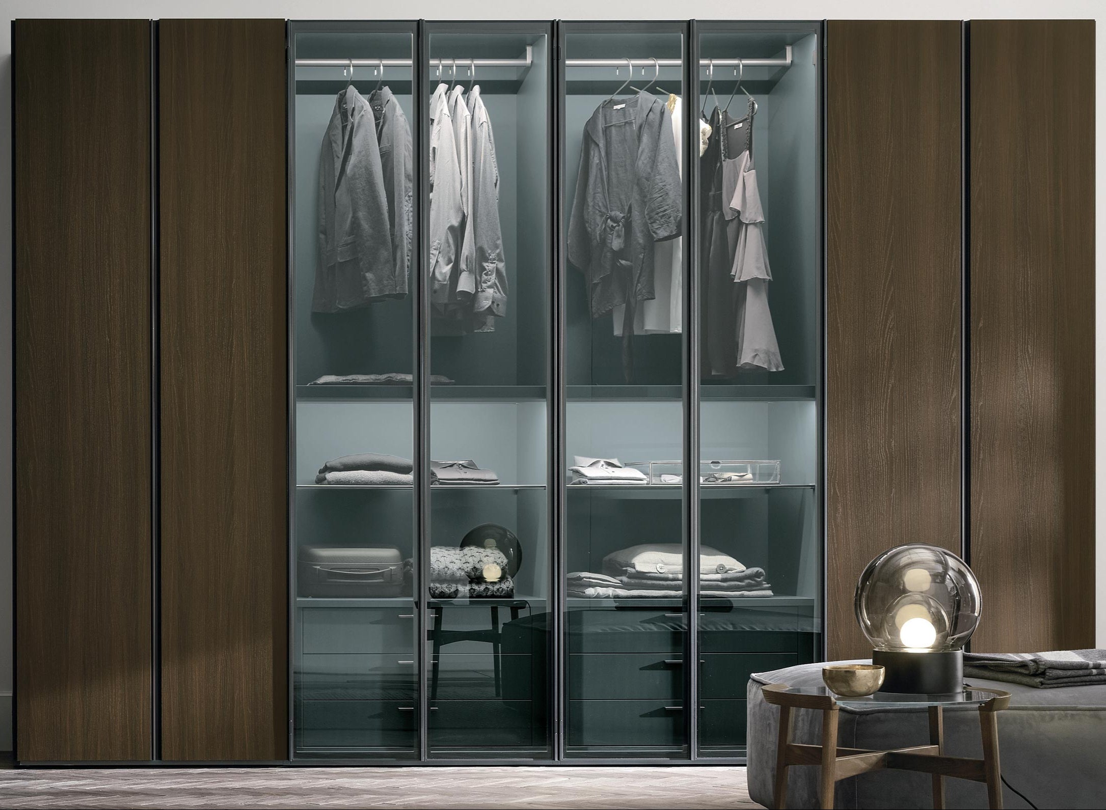 L’armadio Metropolis di Tomasella con ante battenti in vetro reinterpreta in chiave contemporanea il concetto di contenitore.