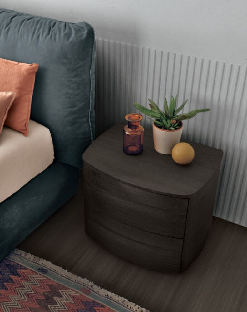 Il comodino Bogart di Tomasella appartiene al raffinato gruppo notte Bogart, una collezione elegante e senza tempo che comprende anche il comò a 3 cassetti e il settimanale a 5 cassetti. Il suo design curvilineo con top arrotondato e maniglia intagliata direttamente nel frontale lo rende un complemento raffinato e versatile, capace di abbinarsi sia a letti dalle linee squadrate che a modelli dalle forme più morbide.