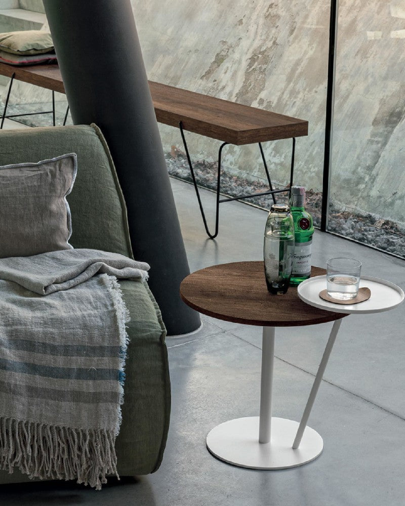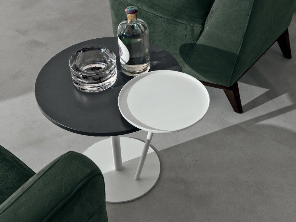 Il tavolino Eclisse è composto da una struttura in metallo verniciato opaco e da due piani rotondi: uno più ampio, realizzabile in finiture materiche (effetto legno, tessuto o cemento) o in tonalità laccate opache o lucide, e uno più piccolo, a forma di vassoio, realizzato anch’esso in metallo verniciato. L’ampia gamma di personalizzazioni offerte da Tomasella consente di creare combinazioni cromatiche e materiche originali, rendendo Eclisse un elemento d’arredo distintivo e dinamico.