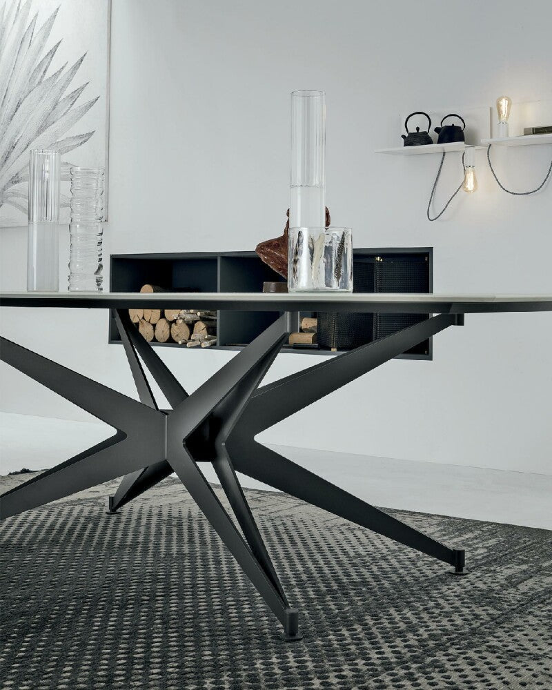 Ispirato alla cometa più luminosa, Halley si distingue per il suo basamento in metallo a forma di stella, un elemento scultoreo che regala al tavolo un’impronta dinamica e scenografica: il suo disegno cambia a seconda del punto di osservazione, trasformandolo in un autentico protagonista dello spazio.