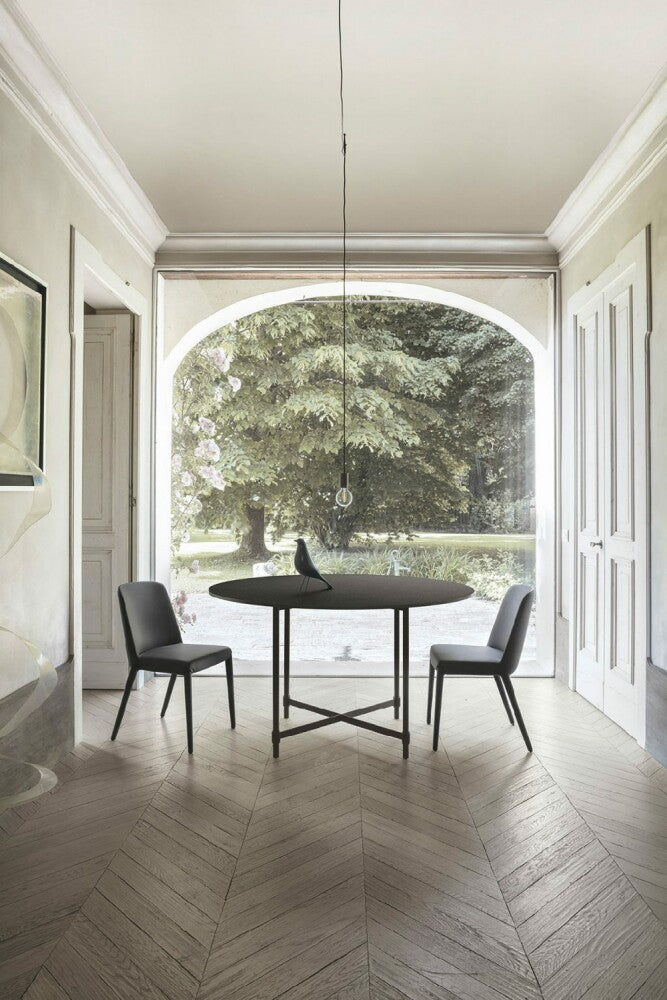 Tower di Tomasella è un tavolo fisso dal design contemporaneo e ricercato, proposto nelle versioni rotonda e rettangolare, che si distingue per il suo basamento in metallo scultoreo e per il piano sottile con bordo a vista, entrambi dettagli che conferiscono al complemento un carattere deciso e raffinato.
