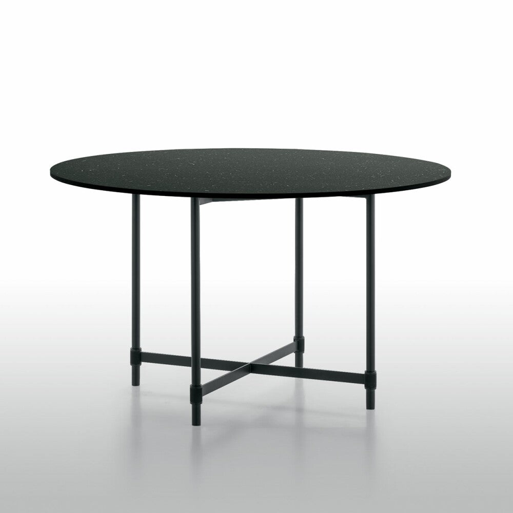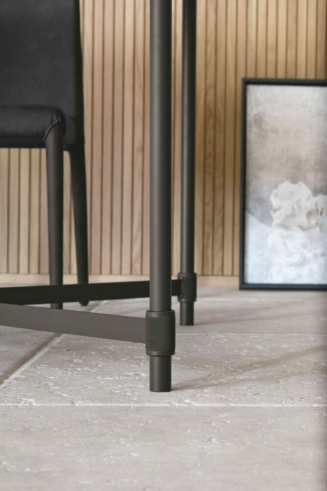 La struttura, in metallo laccato opaco, sostiene con leggerezza il piano in CDF, un materiale innovativo e sostenibile, formato da un pannello in fibra di legno ad alta densità di colore nero, su cui viene applicato un rivestimento personalizzabile in diverse colorazioni e texture. Il bordo nero a vista mette in evidenza la compattezza e la preziosità del materiale, aggiungendo una nota distintiva e moderna al design.