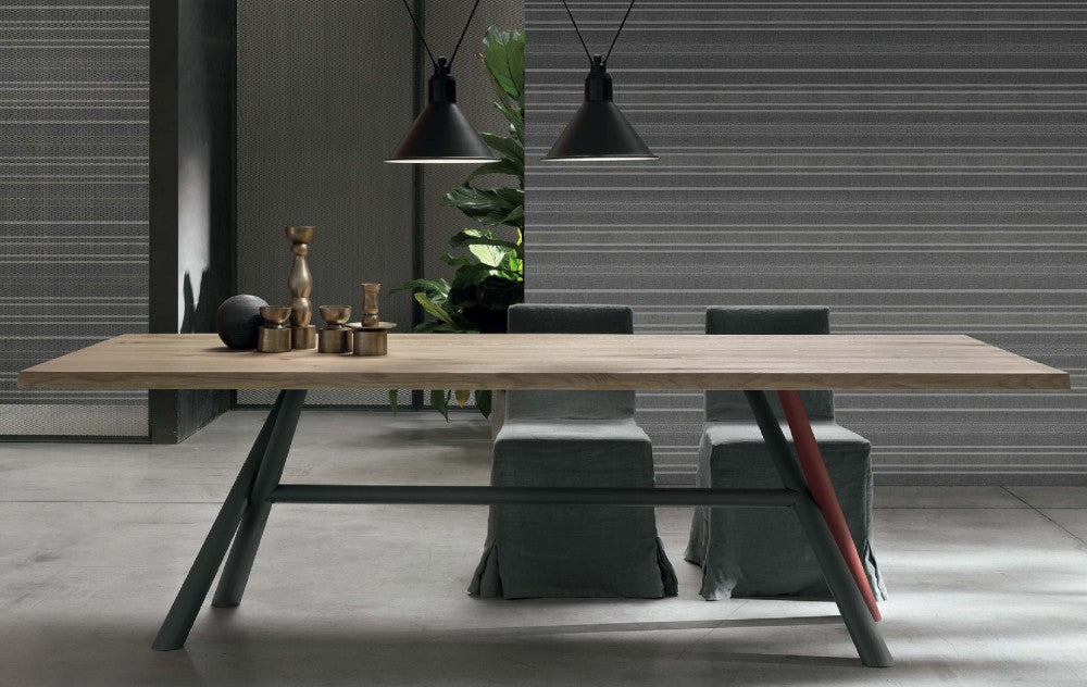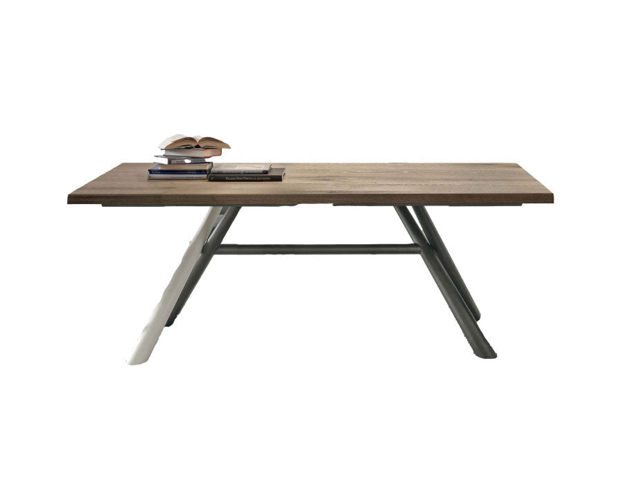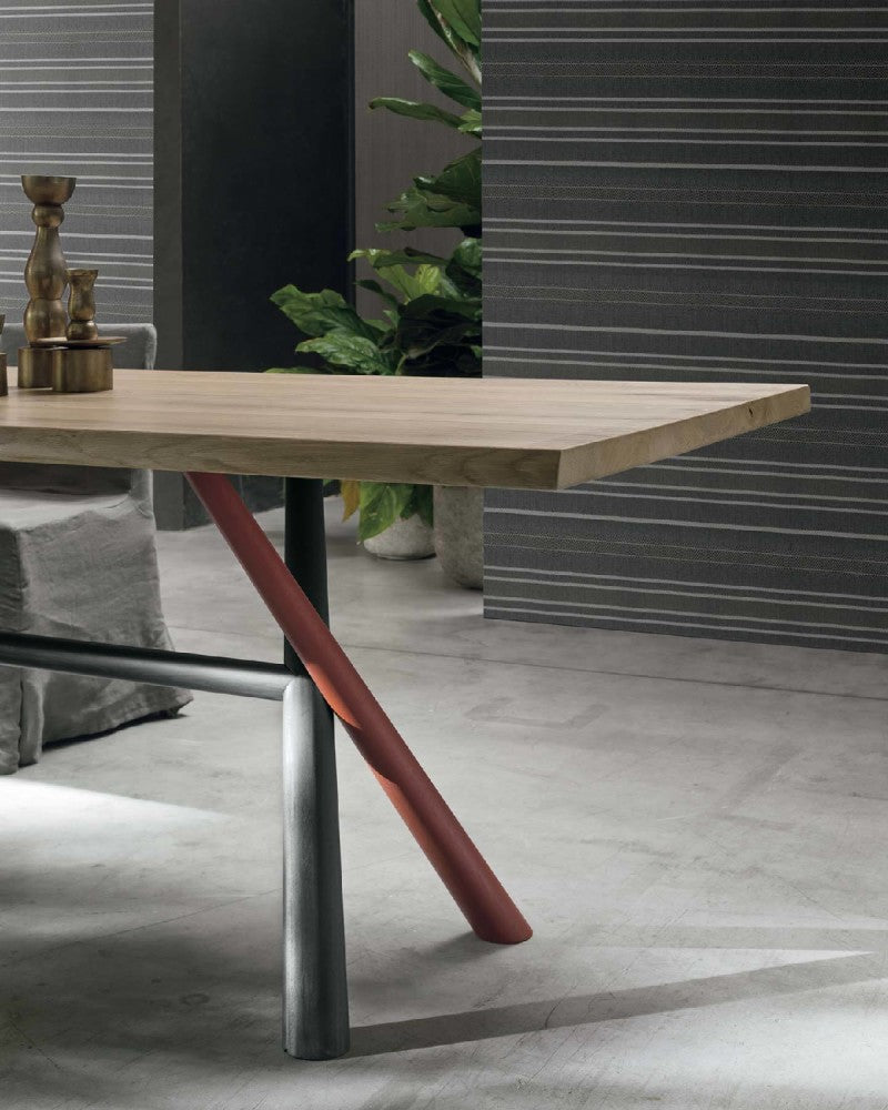 In questa versione, il piano in legno massello di rovere naturale con bordo scortecciato e spessore di 4 cm poggia su un basamento in metallo composto da quattro gambe incrociate, dettaglio che dona leggerezza e movimento alla struttura.