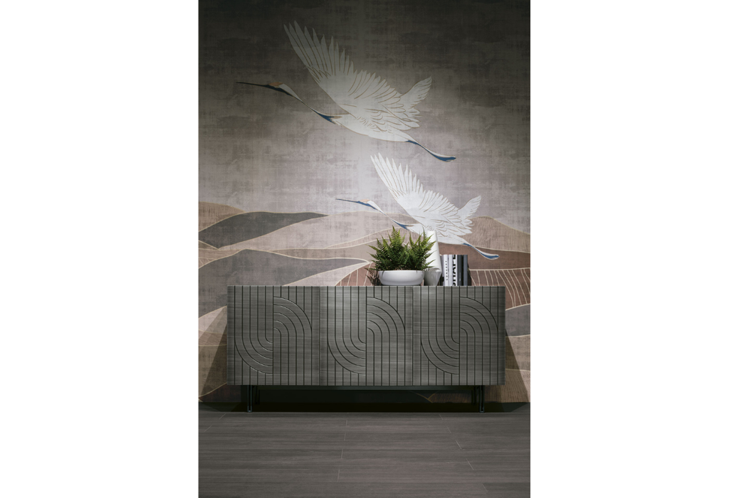 La finitura laccata spazzolata orizzontale crea un raffinato gioco di luci e ombre, esaltando la profondità delle texture e donando alla superficie un effetto materico e tridimensionale.