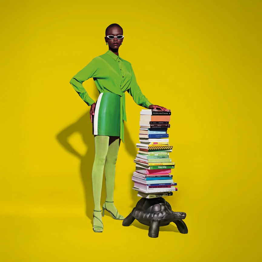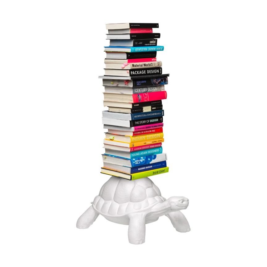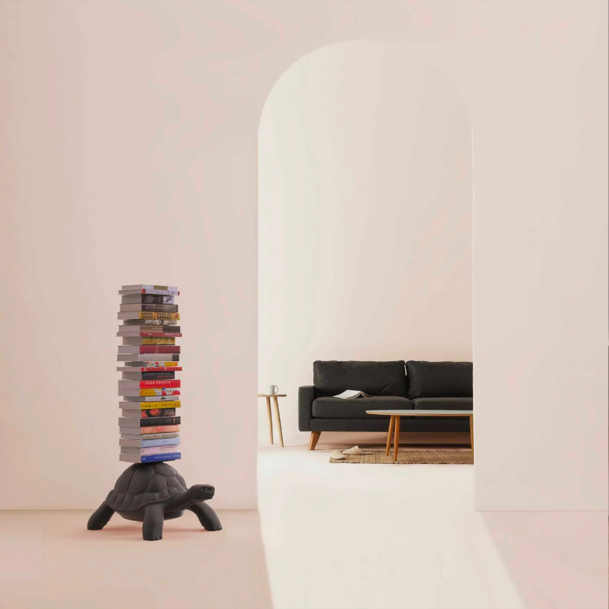 La Libreria Turtle Carry di Qeeboo, disegnata da Marcantonio, trasforma la celebre tartaruga della collezione in un oggetto funzionale e sorprendente: una libreria scultorea che porta sul suo carapace una struttura in metallo con tre ripiani, perfetta per custodire libri, oggetti decorativi o piccoli accessori.