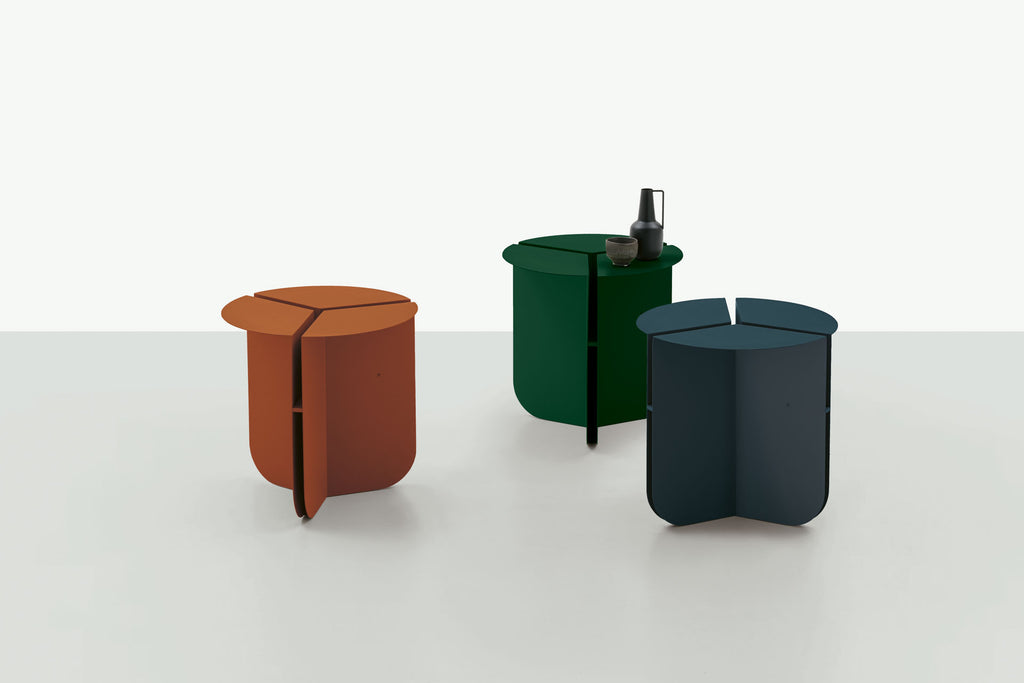 La sua struttura interamente in metallo verniciato è definita da linee pulite e geometriche, e integra fessure laterali pensate per accogliere riviste, tablet o piccoli oggetti, mantenendo tutto a portata di mano con ordine e stile.