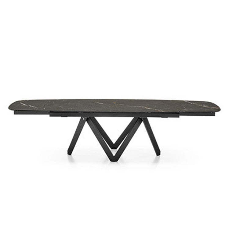 La base, disponibile in metallo oppure in legno, consente diverse interpretazioni stilistiche, dalla più contemporanea alla più materica. Il piano sagomato dai bordi arrotondati, allungabile su due lati, è proposto in pregiata ceramica in diverse finiture, offrendo una superficie elegante, resistente e funzionale, ideale per adattarsi alle esigenze quotidiane e ai momenti conviviali.