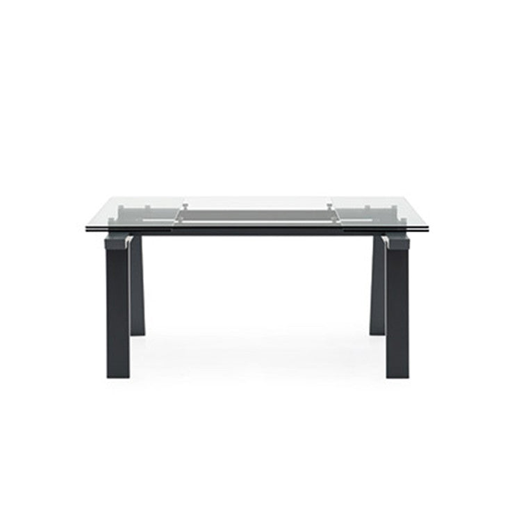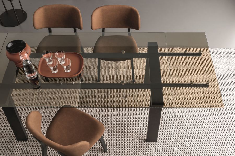 La base in legno massello conferisce solidità e calore materico, mentre le allunghe a vista in metallo introducono un contrasto contemporaneo e funzionale, sottolineando il carattere progettuale del tavolo. Il piano allungabile su due lati singolarmente, realizzato in vetro temprato, garantisce resistenza, praticità e leggerezza visiva, adattandosi con naturalezza alle diverse esigenze di utilizzo.